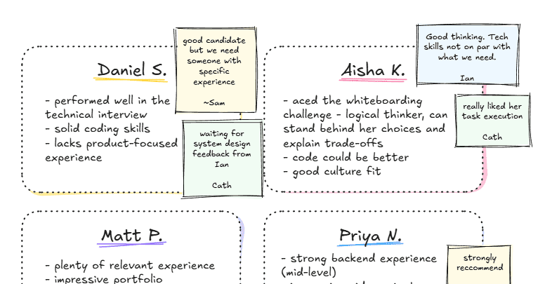 From live whiteboarding interviews and take-home assignments to interviewer notes, online whiteboards improve consistency and decision-making in the recruitment process. By simulating day-to-day work in tech teams, they help make remote hiring more effective, fair, and based on how candidates think, not just on what they know.