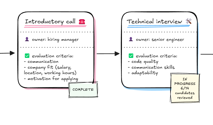 Online whiteboards allow interviewers and hiring managers to visualize hiring stage by stage. With hiring mapped, it's easier to coordinate interviews, track progress, and keep the process consistent and transparent.