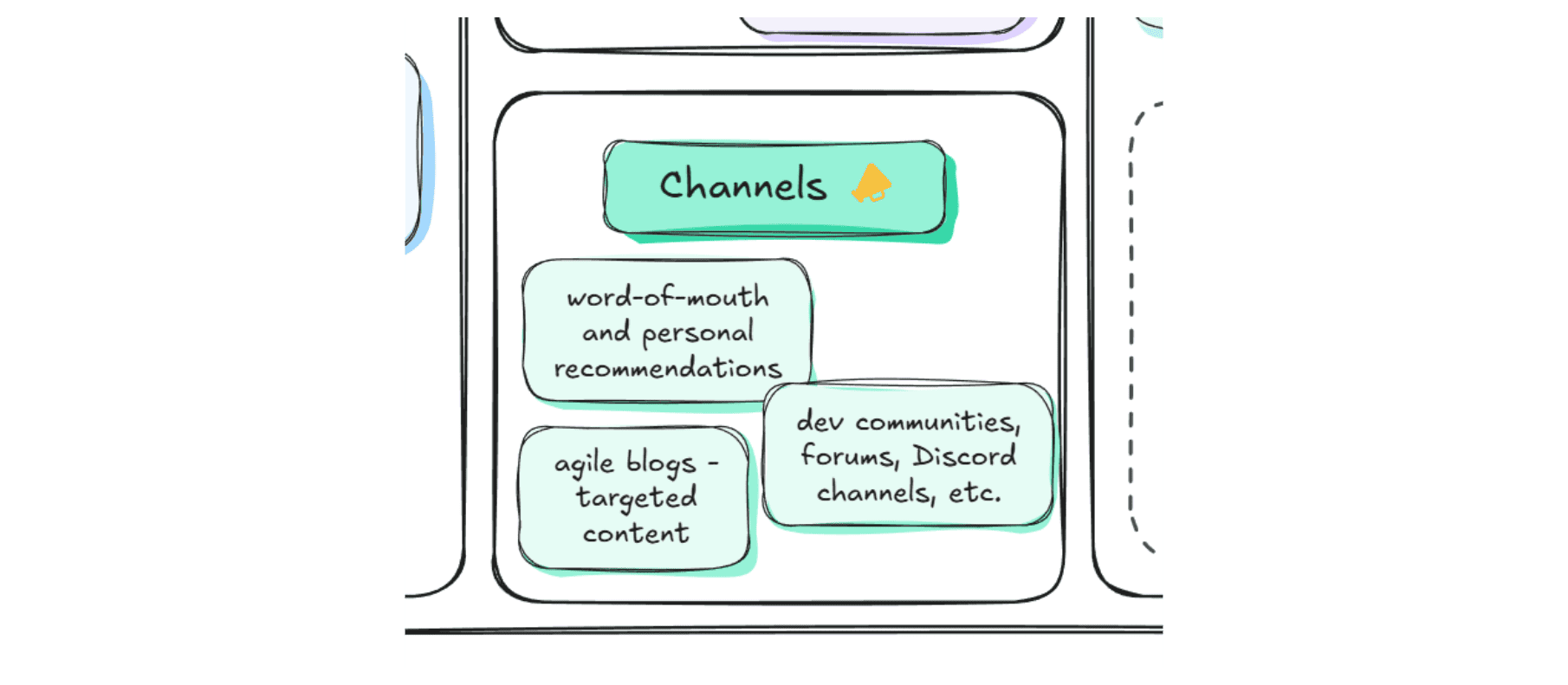 The Channels box covers the paths through which you reach and engage target users. They include marketing, distribution, and communication methods like newsletters, social media, live events, print ads, and more.