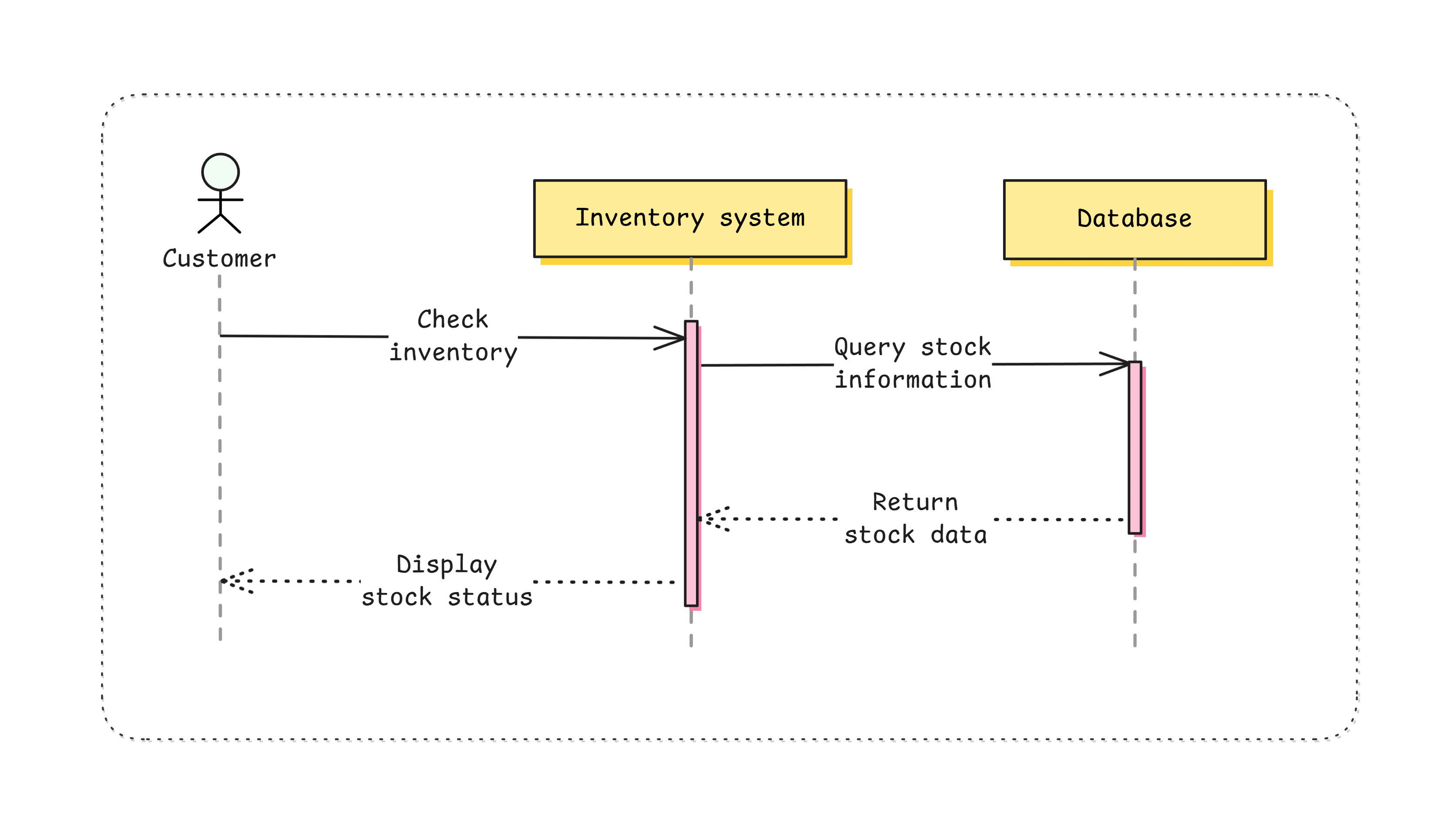 - Here's an example of a prompt and a diagram generated: "Generate a sequence diagram for checking inventory. Use activations and the actor symbol for the customer."